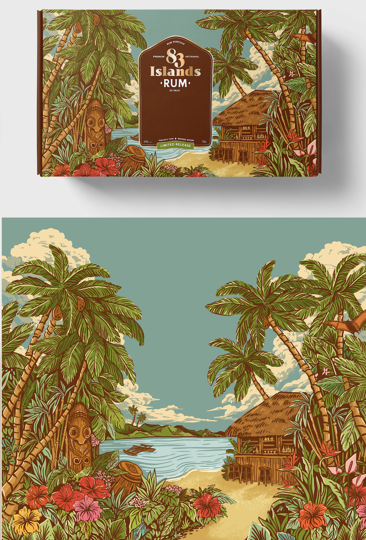 I recently completed a packaging revamp for 83 Islands, creating a series of illustrated tropical worlds designed specifically for their bottle and pack formats.